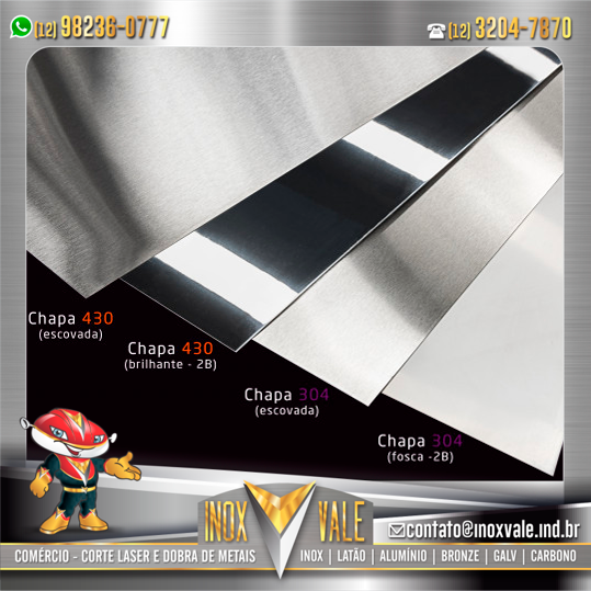 - Aço inox: 304 e 430. Em acabamento natural (2B), escovado e polido.